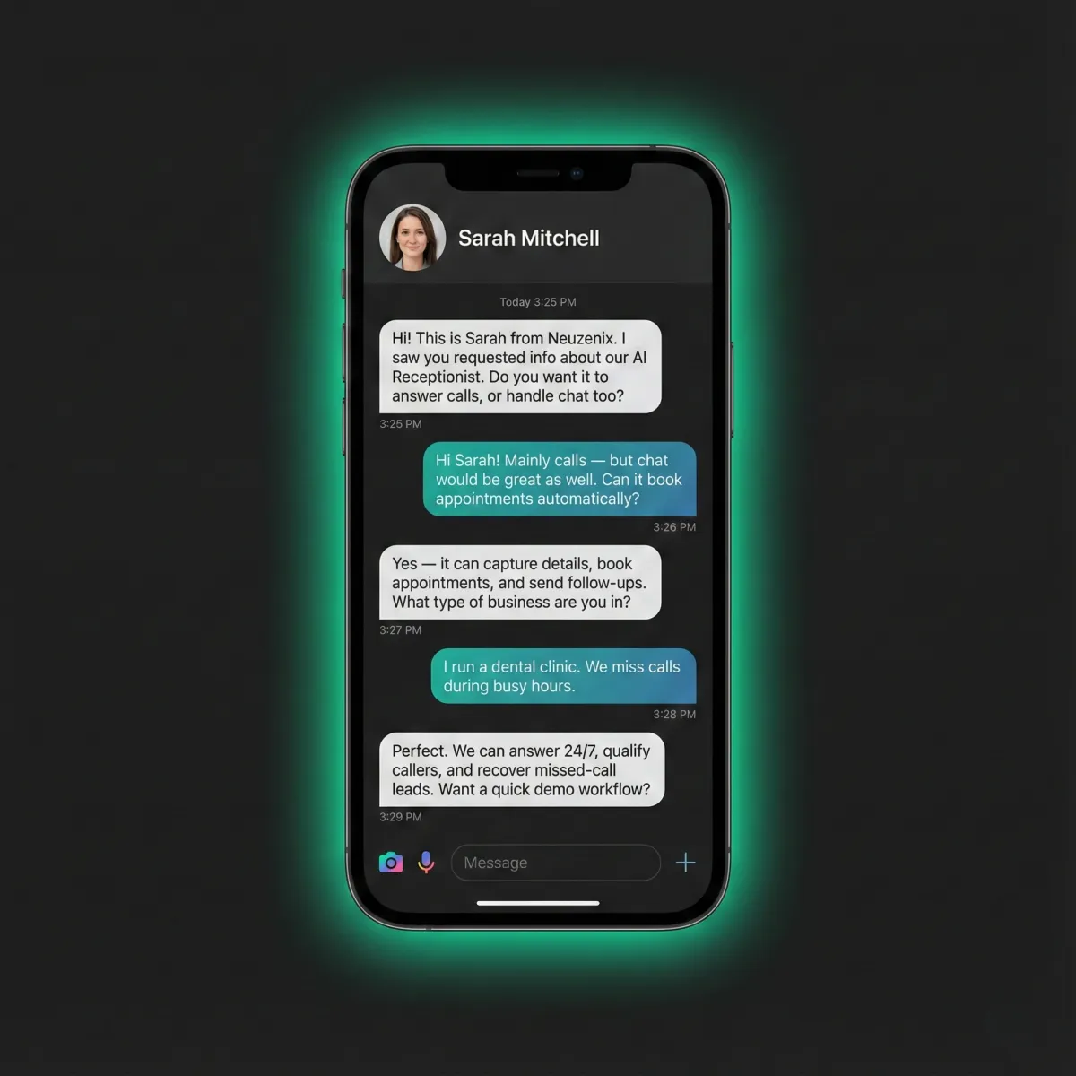Neuzenix Chat AI responds instantly on your website and SMS, answers common questions, captures patient details, and drives bookings—without adding front-desk workload.