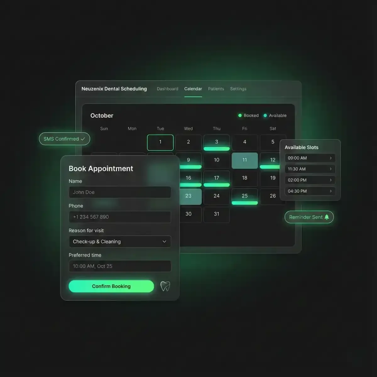 Neuzenix syncs with your clinic calendar and schedules patients instantly from calls and chats. It offers available time slots, confirms bookings by SMS, and sends reminders automatically—so your team stays focused while your schedule stays full.